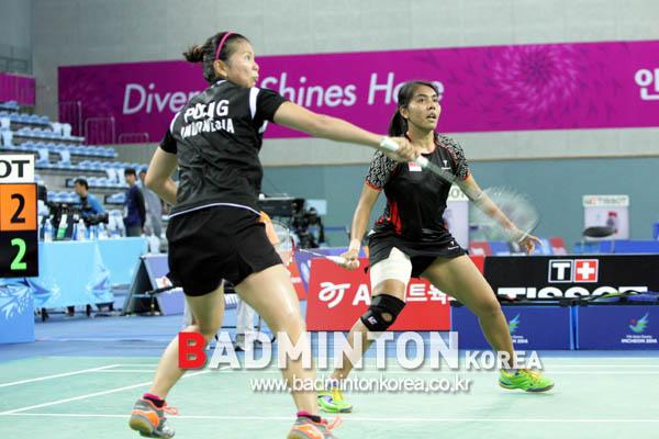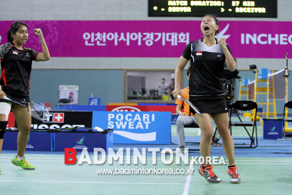 강력한 우승후보 자오윤레이-티안킹 조(중국)를 꺾고 여자복식 결승에 진출한 폴리 그레이시아-마헤스와리 니티아 크리신다(인도네시아).