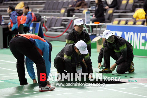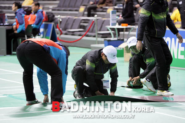 남자복식 결승전 경기 중 코트매트를 수리하는 운영진들.